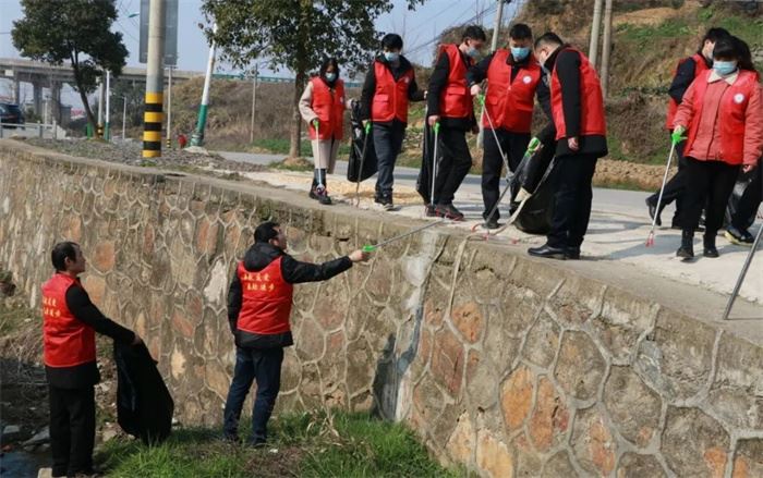 天公作美,鲜红的党旗随风飘扬,志愿者们身穿红色小马甲,拿着钳子、垃圾袋等工具沿着河道、岸边栈道拉开清理工作。大家相互配合,干劲十足,对海螺山港沿线的水面及岸边各类垃圾废物进行全面清理,排查“河湖四乱”(乱占、乱建、乱堆、乱采)、“污水乱排”等问题。督导中,陈敬涛院长看到河道内存有人力难以清理的垃圾,当场电话联系金湖街道负责人,讲明情况,发出督办要求:安排专业力量尽快清理河道,保证河水清澈、河道整洁。
